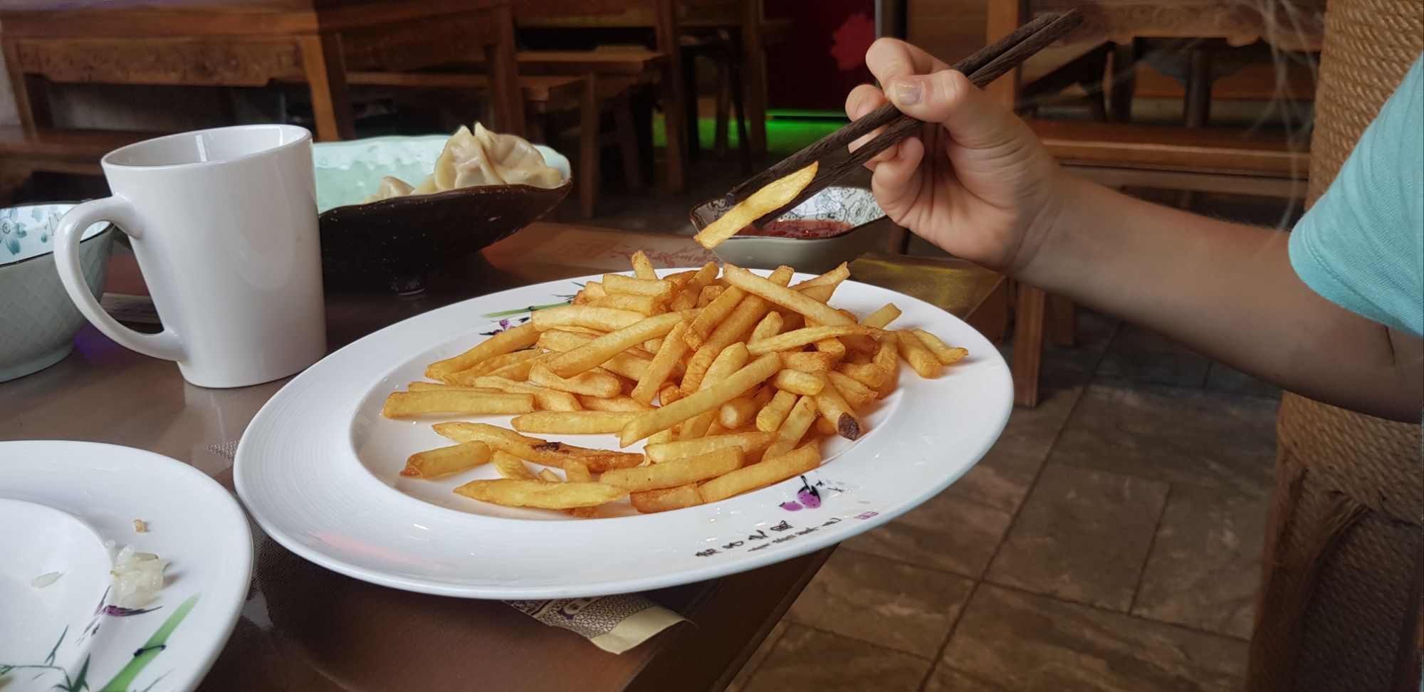 Nous nous posons dans un restau au frais pour déjeuner quelques raviolis et du riz.