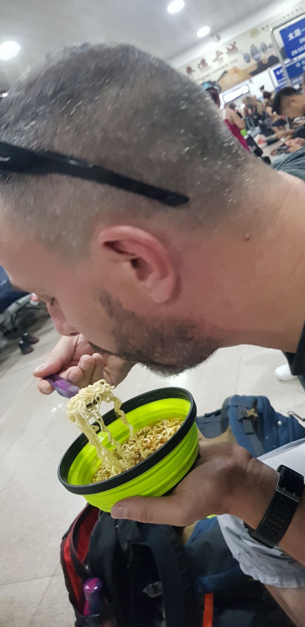 En attendant notre train, nous mangeons dans la gare des nouilles déshydratées dans nos gamelles prévues à cet effet. Et oui, en Chine, on trouve partout de l’eau bouillante pour pouvoir manger ou se faire du thé.