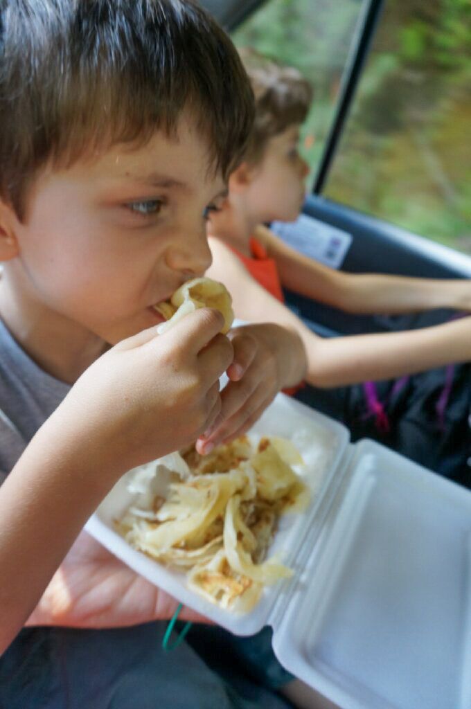 Il s’arrête en chemin s’acheter de quoi grignoter et part avec Eric lui montrer quelques spécialités hindoues. Il décide finalement de nous les offrir : des nans au sucre pour les enfants qui se sont régalés et des beignets aux pommes de terre pour nous.