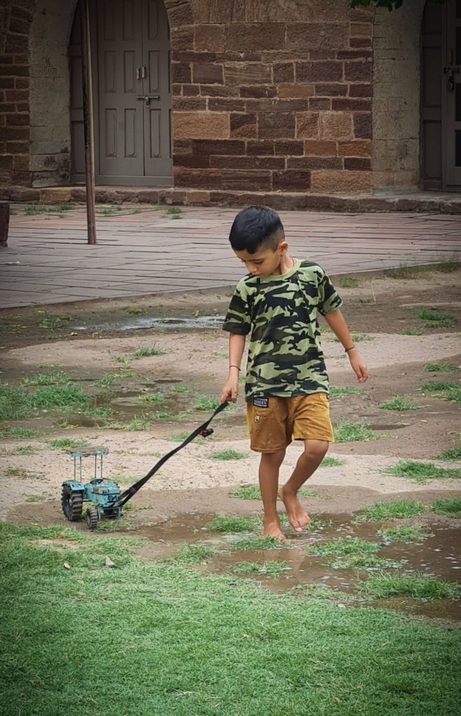 Près des remparts, un enfant joue avec son tracteur