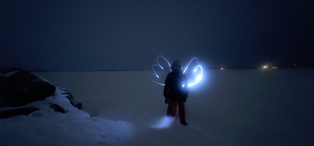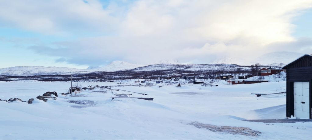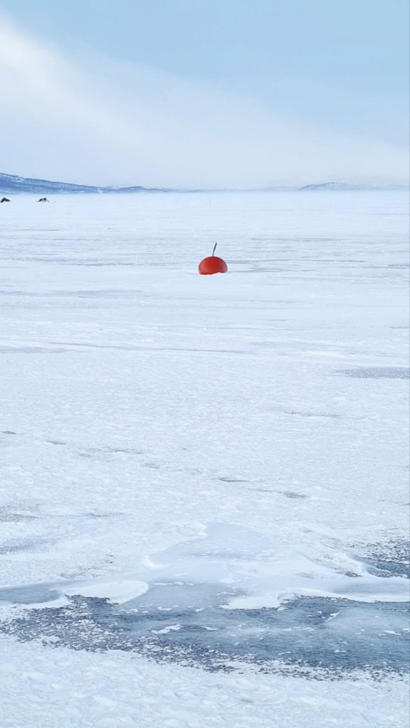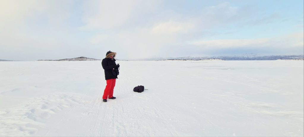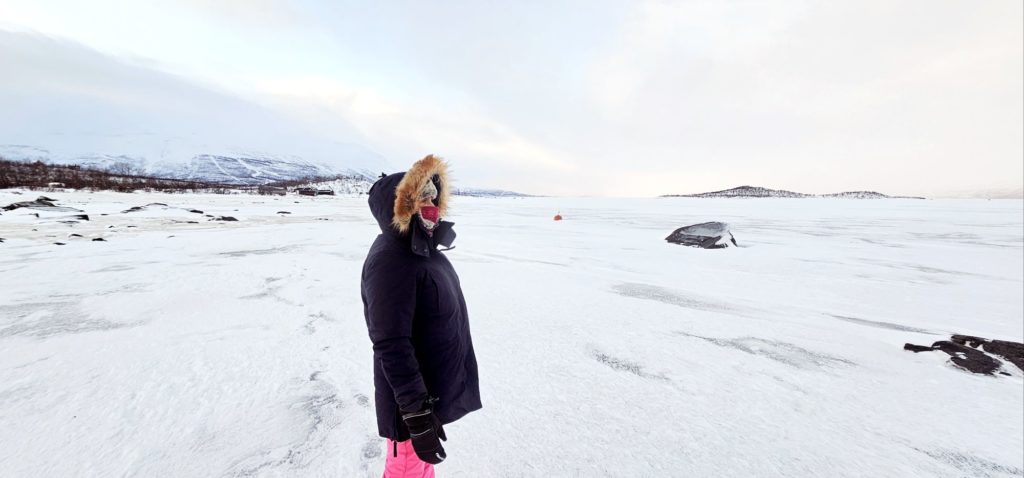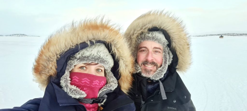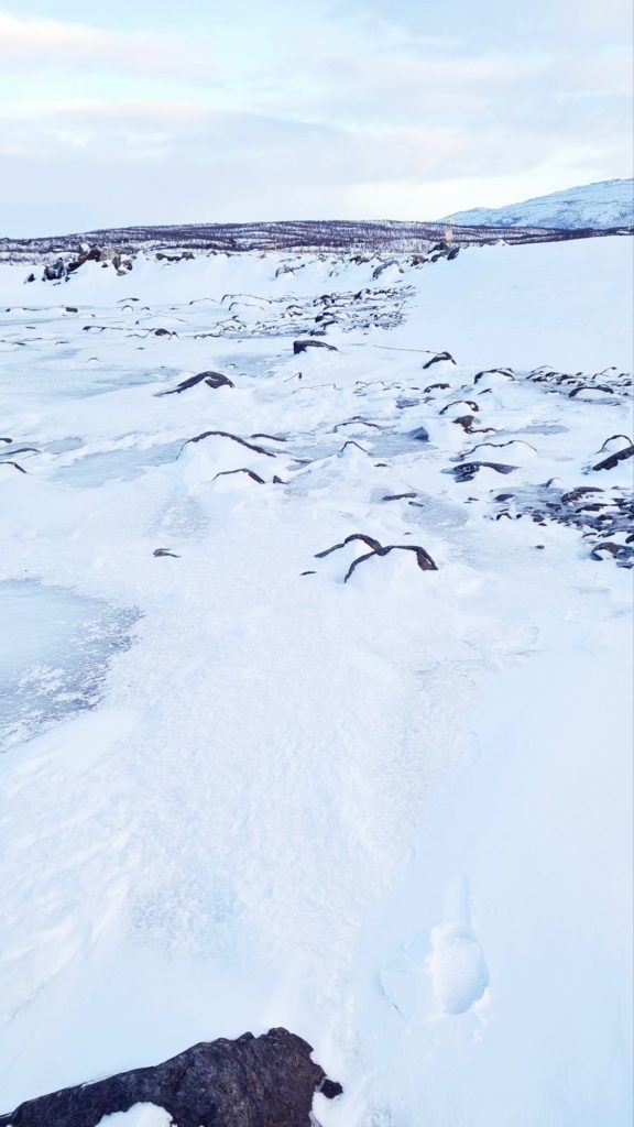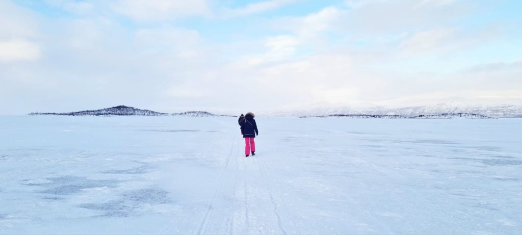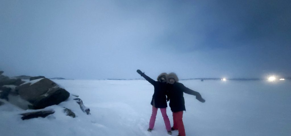Nous déjeunons et partons marcher sur le lac gelé. Eric souhaite faire quelques plans de drone, et nous aimerions bien voir à quoi il ressemble de jour.