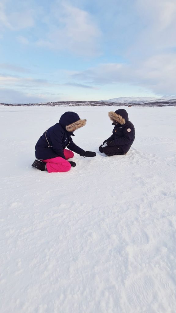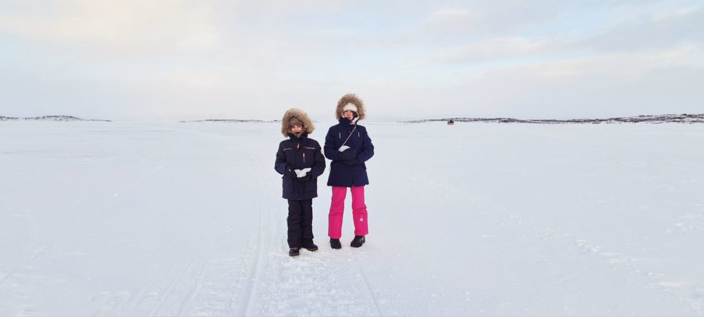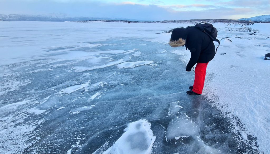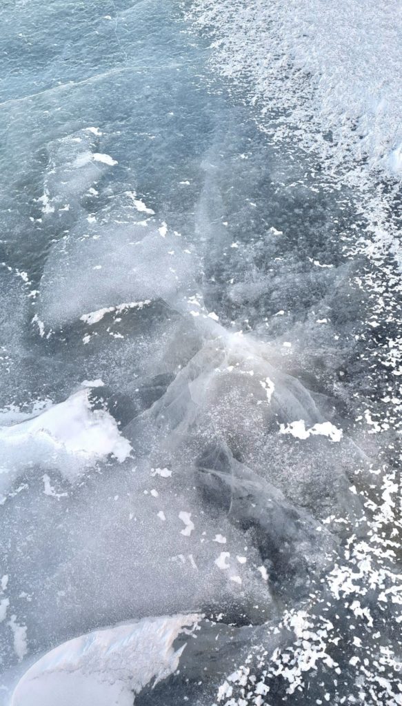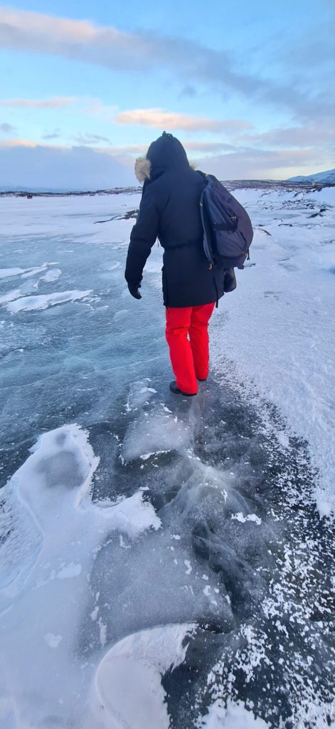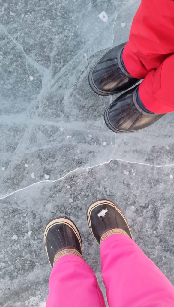 Il fait très froid, mais nous sommes bien couverts, c’est parfait. Les enfants jouent avec des morceaux de glace énormes. Nous marchons jusqu’au centre du lac, puis nous nous baladons près du rivage où des rochers affleurent à peine la surface, c’est super beau !