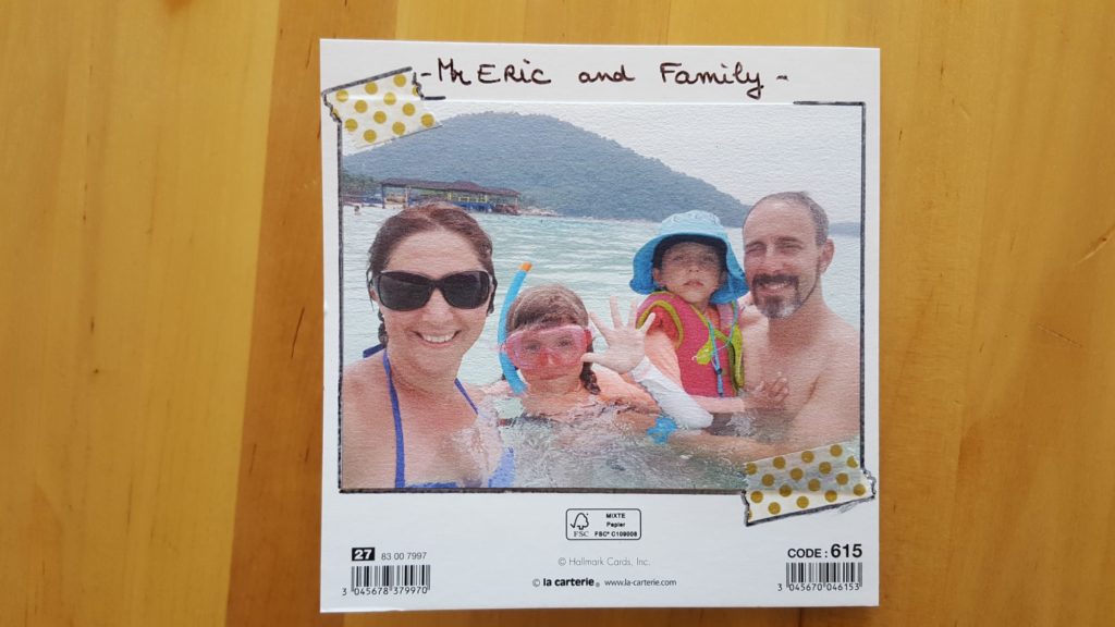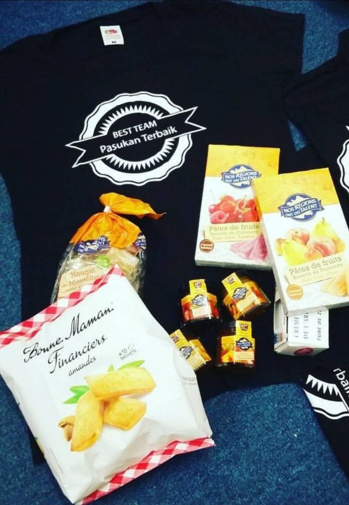 Dedans, nous avions mis toutes sortes de spécialités françaises (non périssables et qui ne fondent pas trop !) comme des confitures (de fruits européens), des pâtes de fruits, du nougat, de la crème de marrons, des financiers, etc… ainsi que des tee-shirts que nous leur avons imprimés !!